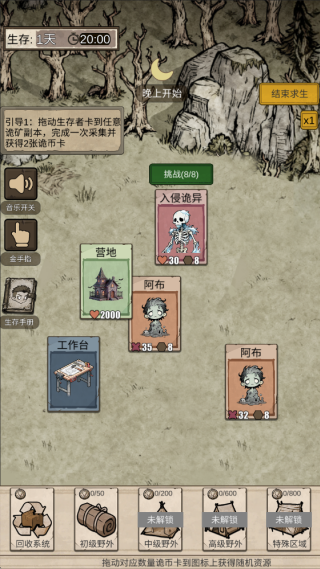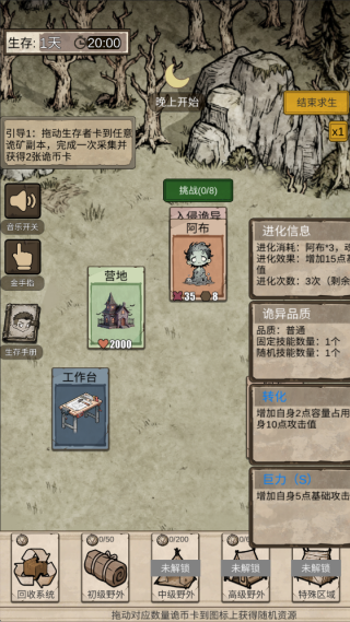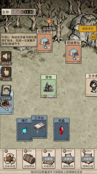 1、进入游戏,点击开始求生置身于陌生的荒野中,拖动生存者卡到任意诡矿副本,完成一次采集并获得2张诡币卡。