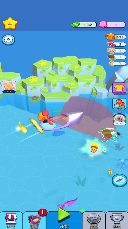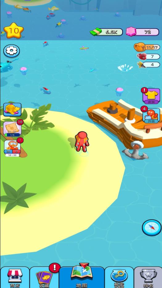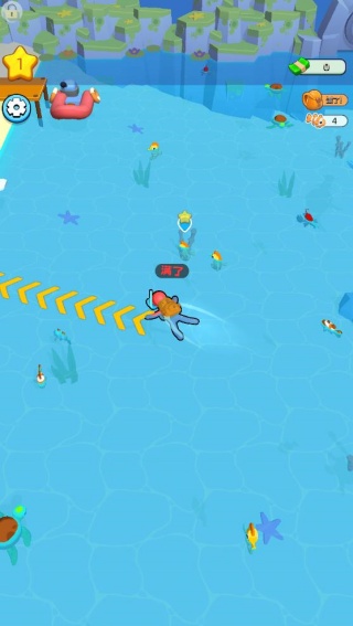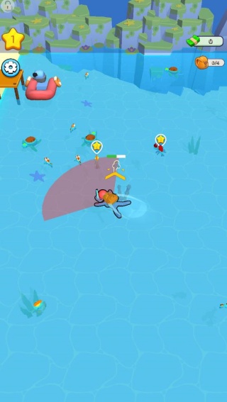 1、在水域中操控角色利用捕捞工具,瞄准各类鱼类进行捕捞,优先选择稀有鱼类,丰富水族馆的馆藏种类,为后续经营积累资源。