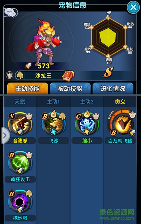 沙拉王作为高生存型宠物,其六维属性显示物攻与速度仅为一般水平。主动技能中,“音速拳”具备高威力与高命中率,配合“疯狂攻击”可实现速度追击,而“挖地洞”效果相对平庸。值得注意的是,该宠物拥有5个被动技能槽且无援助槽,为技能搭配提供了极高自由度。