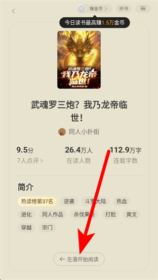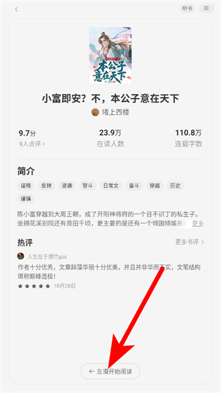 2. 在小说详情页,向左滑动屏幕即可开始阅读,进入阅读界面。
