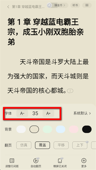 4. 在设置菜单中,可通过点击“A-”或“A+”按钮,或直接选择预设字号,轻松调整字体大小,打造专属阅读体验。