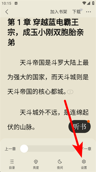 3. 进入阅读界面后,点击右下角的“设置”按钮,打开设置菜单。