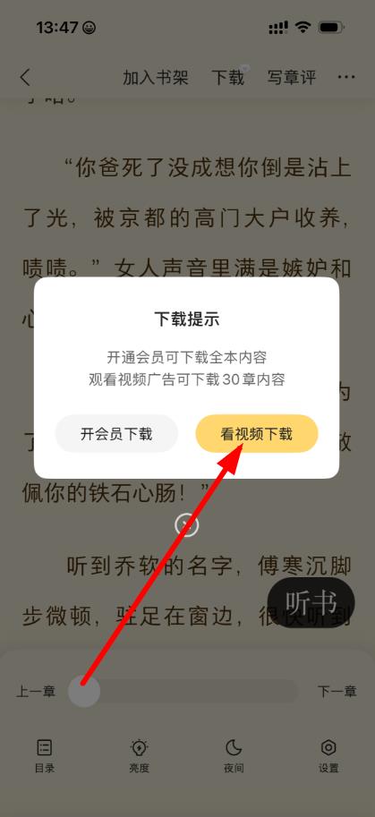 3. 若未开通会员,系统将提示通过观看广告免费下载部分内容——点击“看视频下载”,完成广告观看后即可下载最近30章内容,实现离线阅读。