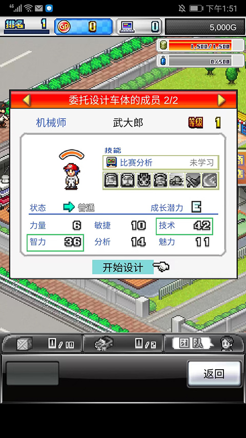 8、在开发之前还需要选择机械师来进行车体的设计,可通过机械师的状态、成长潜力、力量、智力、敏捷、分析、技术和魅力等参数来选择,选择好后点击【开始设计】选项,