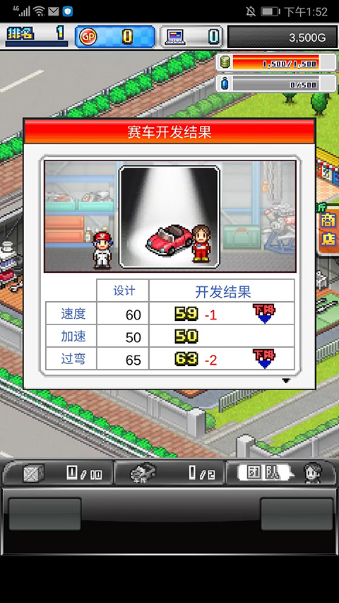 9、车体完成后,就开始正式开发赛车了,如图,可看到赛车的速度、加速和过弯设计与开发结果的对比参数,