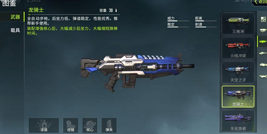 2、龙骑士:全自动步枪,后坐力低,弹道稳定,性能优秀,推荐新手使用,装配核心之后,可以大幅度减少换弹时间和降低开火后坐力。稳定性比较好。