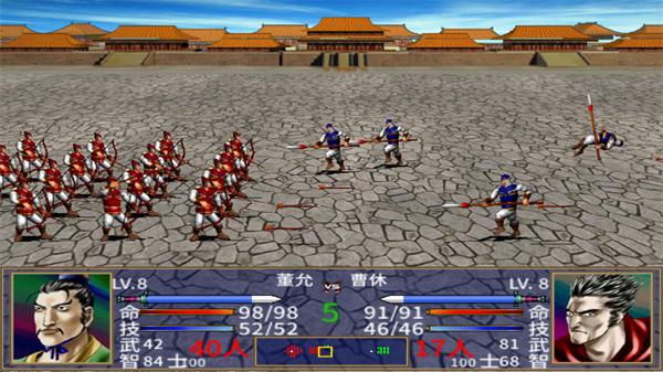 首先进入战前准备,交战双方的人马会同时出现在屏幕两边,交战规则采用淘汰制,每次各派一名将领出战。胜利的武将可再次出战,而败阵或平手的武将便无法再出阵。直到一方不能再派出武将为止。而在此可对武将的出战顺序、阵形的选择、武将在阵形中的位置以及军师指令进行调配。当然,如果看出大事不好,也可选择退兵——脚底抹油,开溜。但要记住:若连续退兵三次而未能进城休息,第四次退兵时将会全军被俘。