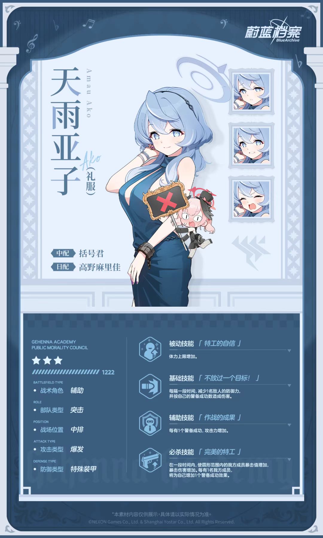 为了在歌赫娜的特别宴会上也能一如既往地辅佐日奈,自己也果断穿上了礼服。她平时处理事务的能力本就滴水不漏,受到风纪委员会众成员的敬仰,而这次她会更上一层楼,以完美特工的身份大显身手……自信满满的亚子如是说。