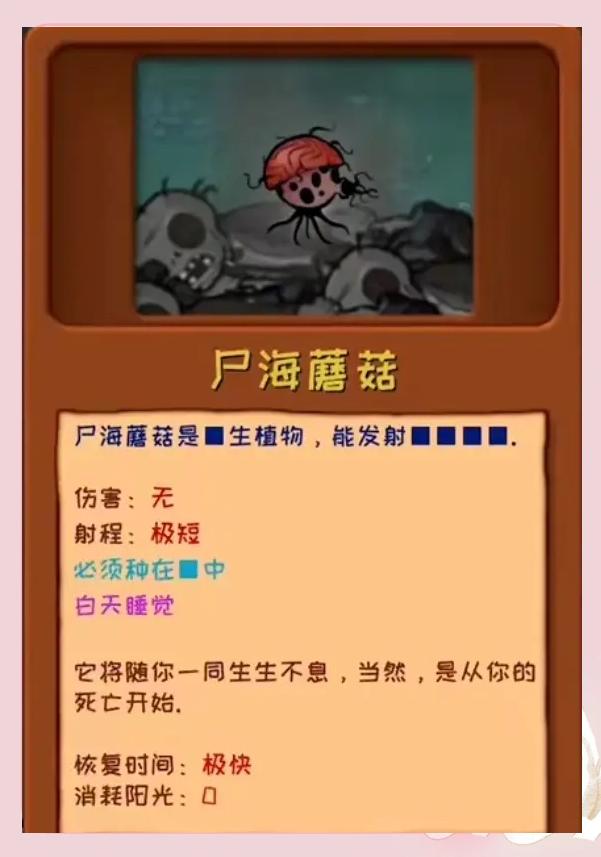 1、尸海蘑菇:生植物,无伤害,极短射程,必须种在墓碑中。白天睡觉,随你生生不息,从你的死亡开始恢复,恢复时间极快,消耗阳光为0。