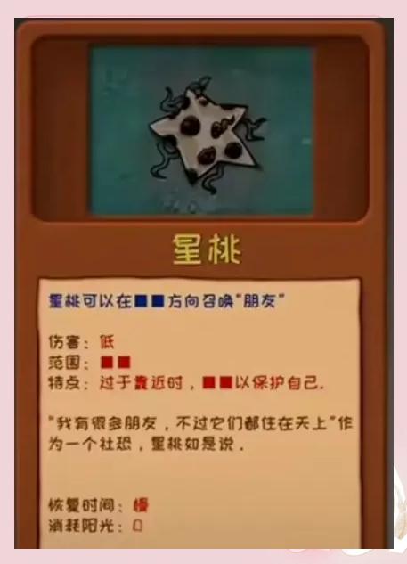 6、星桃:在方向召唤“朋友”,伤害低,范围广,特点过于近时保护自己。恢复时间未知,消耗阳光为0。