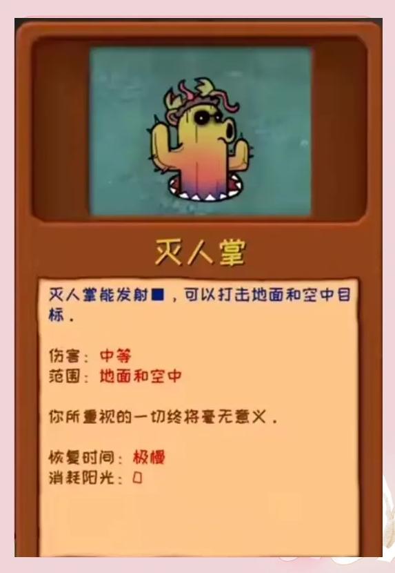 3、灭人掌:发射,打击地面和空中目标,伤害中等,恢复时间极慢,消耗阳光为0。