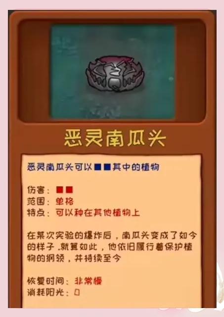 7、恶灵南瓜头:可以种在其他植物上,保护植物。恢复时间非常慢,消耗阳光为0。