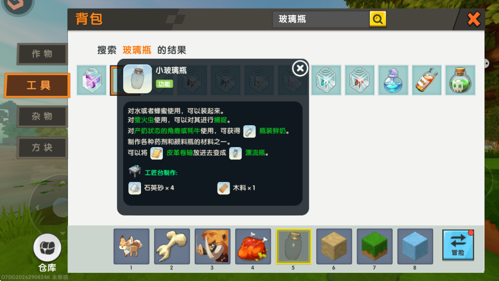 2、制作好小玻璃瓶后,点击物品,然后走到水域旁边,点击水域使用