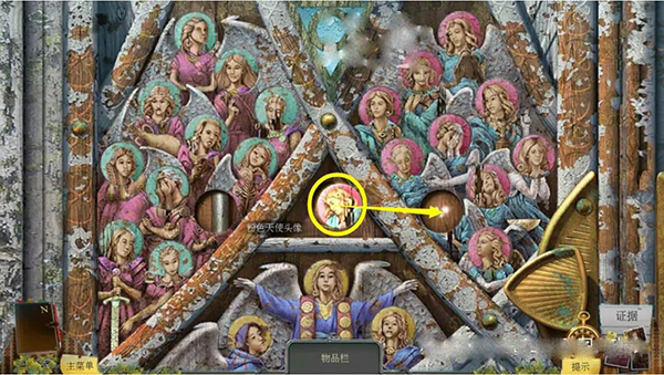 交换天使头像使其放置在正确的位置上;玩完第一个交换头像,会从中间拿到【粉色天使头像】,再把它放在右边的圆圈缺口上,接着完成第二个交换头像,然后把物件栏的【蓝色天使的头】放进左边的圆圈缺口上,最后完成小游戏,打开【教堂内】场景。