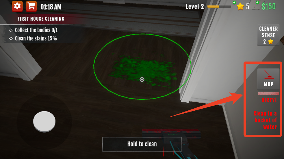6、这时候我们点击【MOP】拿出拖把,将中间的光标对准地上的血迹出现圆圈时长按就能开始清理。