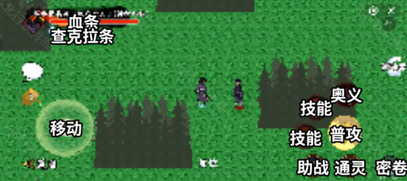 1、屏幕左上角红色的是血条,血条下方橙色的是查克拉条;屏幕右下角分别是普攻、奥义、技能、助战、通灵和密卷