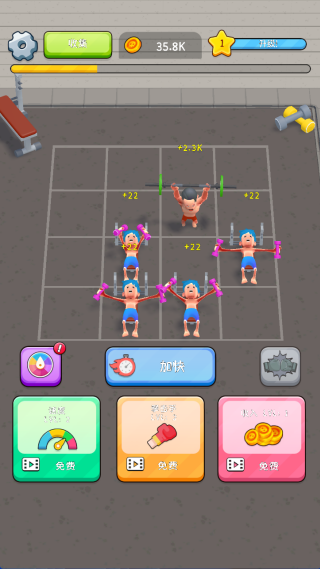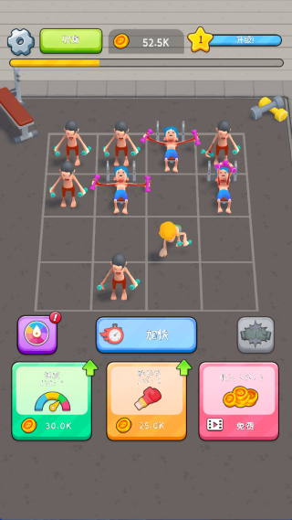 1、通过点击加速可以不断的获得健身的小人,相同级别的小人可以滑动合并升级。