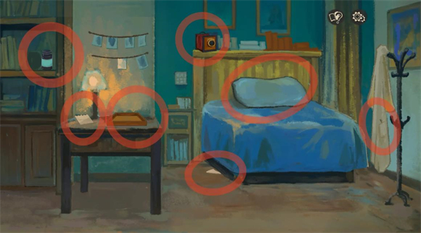 6、之后会出现两个选项,两个选项最后都是进奈特的房间,拿走柜子上的显影剂和桌子上的空盘子,拿取床头柜上的老相机,翻转相机得到胶卷底片,点击枕头拿走枕头下的钥匙2和衣架上衣服口袋里的钥匙1,捡起床下的纸片。点击桌子上的本子将纸片放上去,得到1018数字。
