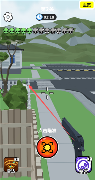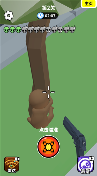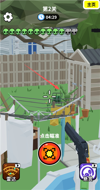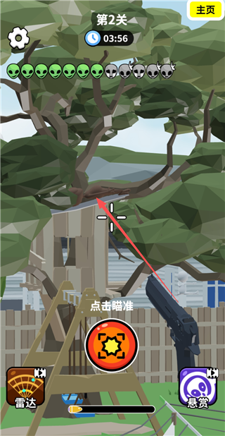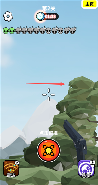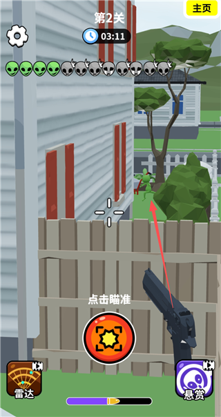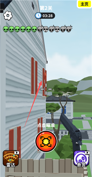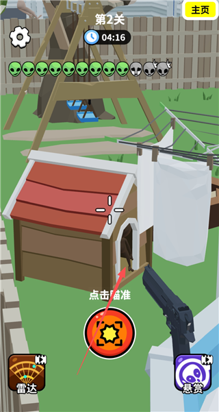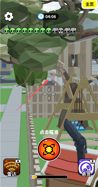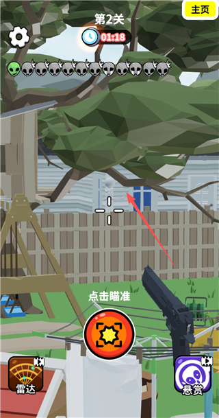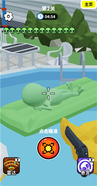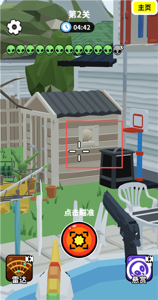 1、游戏以闯关为核心,玩家需要在限定时间内找到并击毙所有目标,同时注意场景中可能伪装成小型物体的外星人。