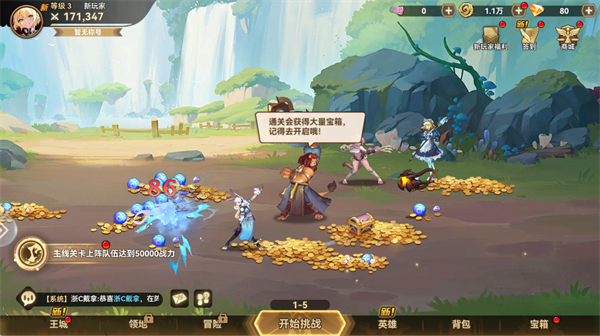 通关关卡可获得大量金币、道具宝箱,同时主线关卡对队伍战力有明确要求。