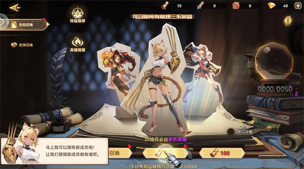 先知召唤可获取常规三系英雄,20抽后必出紫色英雄,是获取强力卡牌的重要途径。
