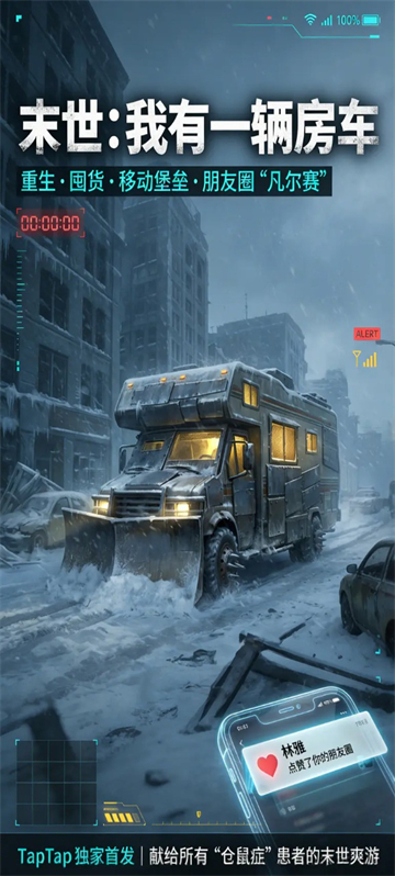 末世我有一辆房车是一款以末日生存为主题的手游,在这款游戏中玩家将扮演一位重生到末日降临前的最后7天前的主角,需要通过未来的记忆开始囤积物资,在改造好车辆并放置好各种物品之后,就能在极寒断电、秩序崩塌的世界中过上物资充裕、温度恒定、精神富足的末日生活。