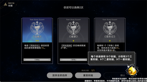 7、通关后可获得【祝福】奖励。每个命途拥有18个祝福,分别有3个三星祝福、6个二星祝福、9个一星祝福,合理搭配祝福将大幅提升通关效率。
