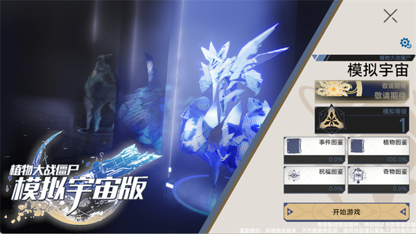 2、进入主页后,可以看到部分模式仍在开发中。玩家可浏览事件图鉴、植物图鉴等,准备就绪后点击【开始游戏】开启冒险。