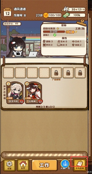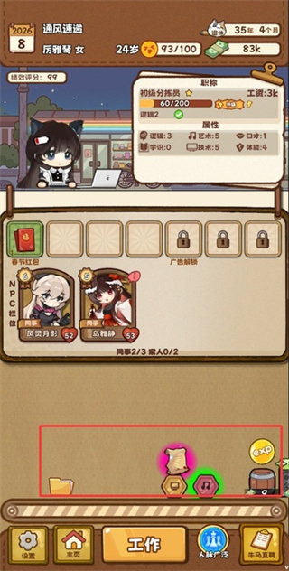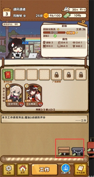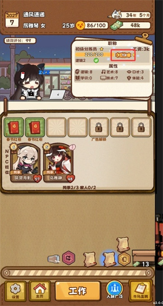 点击下方的工作会消耗心情来获得工资,并且流逝时间,玩家要避免心情过低并存活到退休