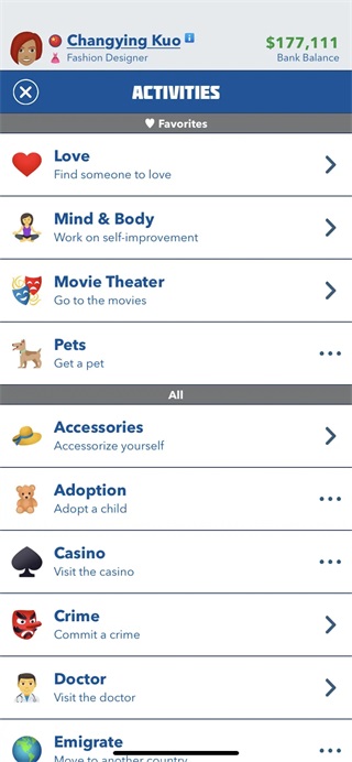 5、Love选项里是找对象,Mind&body是健身散步照顾花园看书等,Pets里可以买或收养各种宠物(最爱玩的内容!),还可以收养孩子,赌场赌博,各种犯罪,移民到其他国家