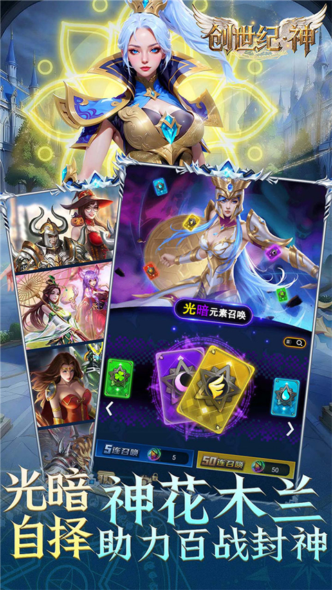创世纪神是一款策略卡牌战斗玩法的手游,在这款游戏中玩家将来到一个有着神奇力量的世界,在这里玩家可以在有着不同属性的天神角色中进行选择和搭配,组建好小队时候,就能前往各种各样的副本关卡进行挑战,将来袭的敌人和怪物全部消灭就能获得奖励,可以用来提升天神的等级和装备。