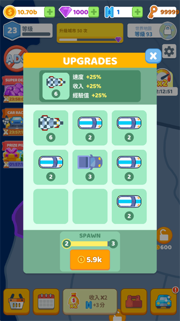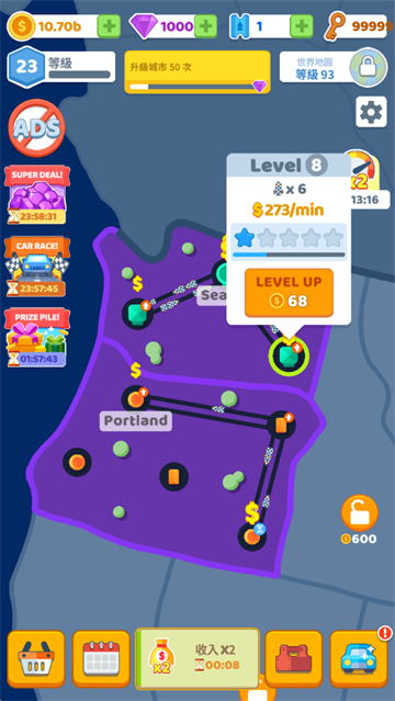 3、升级您的城市以制造更多汽车,驾驶通过你的公路的车越多,你获得的收益就越多