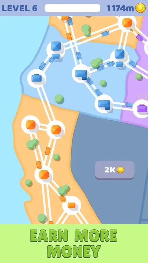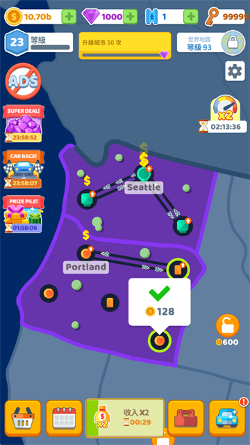 1、游戏中拖动屏幕将两个地点连线,这样就可以花费金币建造公路,实现通车从而带来收益。