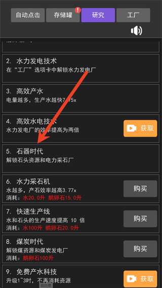 2、积累4升水后在研究栏升级到石器时代,为后期自动化生产做准备。