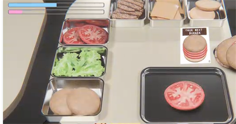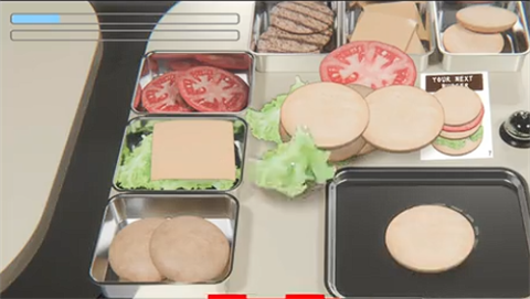 2、玩家的目标是完成订单的时,迅速组装并食用按菜单制作的汉堡来恢复体力,从而躲避惩罚。