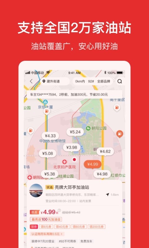 - 覆盖全国300+城市,接入10,000+加油站,加油选择更丰富;