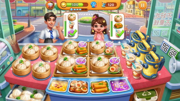 4、连连上菜关卡侧重连击机制,通过连续上菜触发额外金币奖励,最终达成更高营业额目标。此类关卡通常无严格计时限制,关键在于把握顾客心情值耗尽前完成上菜。最优策略是积攒5道菜品后一次性送出,最大化连击收益。